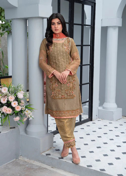 A woman wearing a brown traditional Eastern outfit with embroidery and a dupatta.